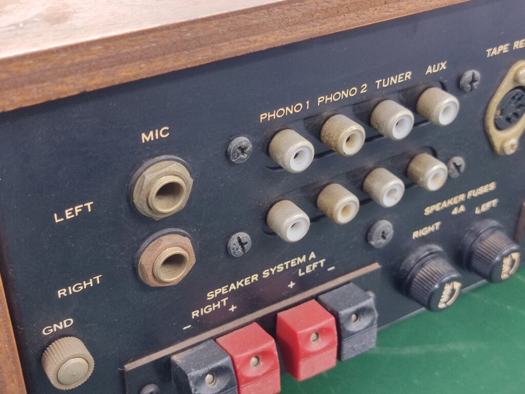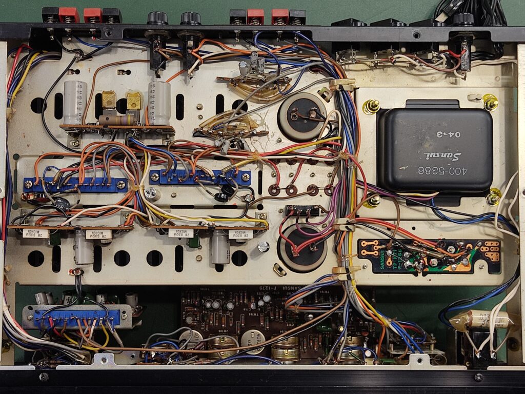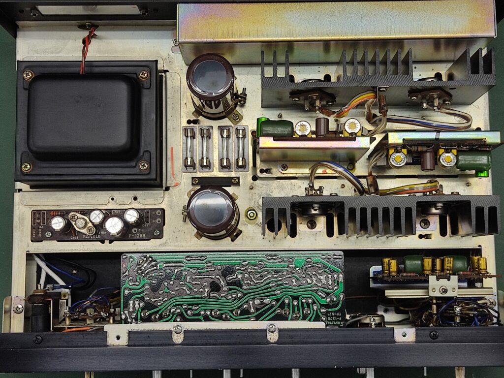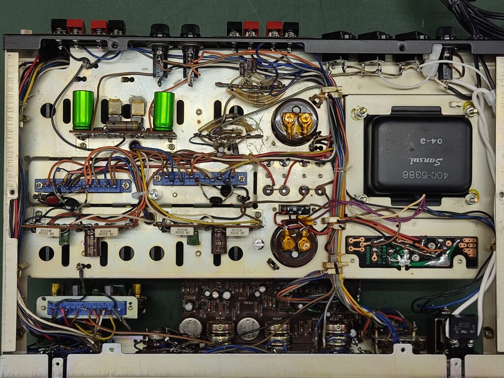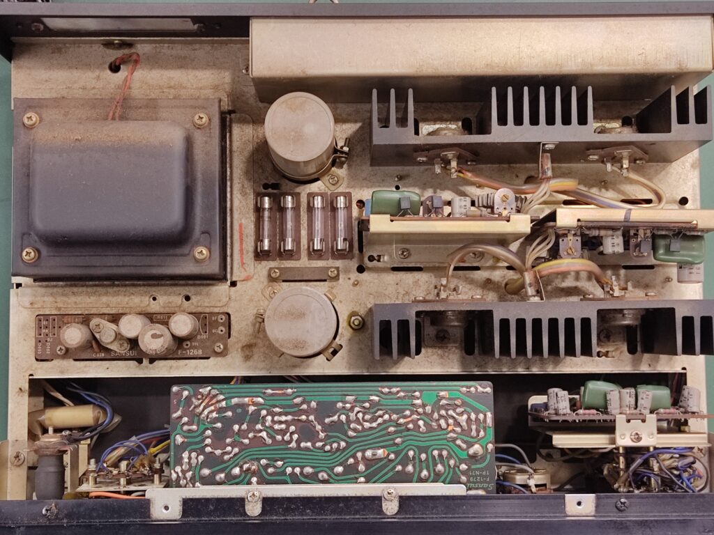 1970年代の名機ですが、保存状態が悪く、全体的にほこりや汚れ、内部においても基板、はんだの劣化・腐食、ヒューズ切れ、トランジスタリード劣化等見受けられる状態でした。